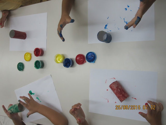 Tα γράμματα μοιράστηκαν στα παιδιά, σύμφωνα πάντα με την επιλογή που είχαν κάνει και προτάθηκε να τα ζωγραφίσουν με ένα ιδιαίτερο και ευχάριστο τρόπο. Τους μοίρασα μπατονέτες, επέλεξαν χρώμα δαχτυλομπογιάς και ξεκίνησαν τη δουλειά προκειμένου να γεμίσουν τα γραμματάκια τους.